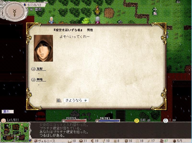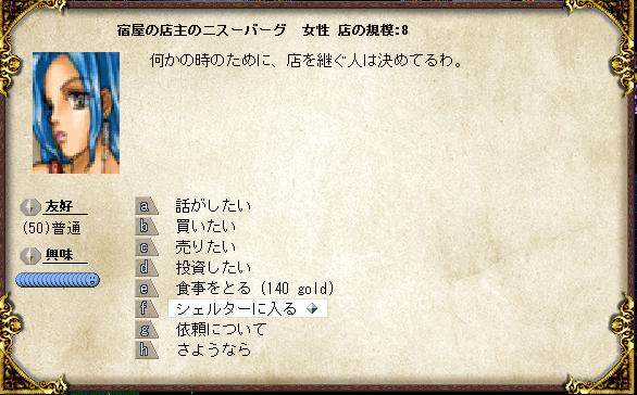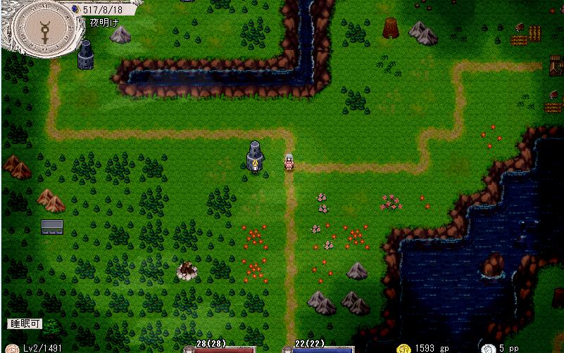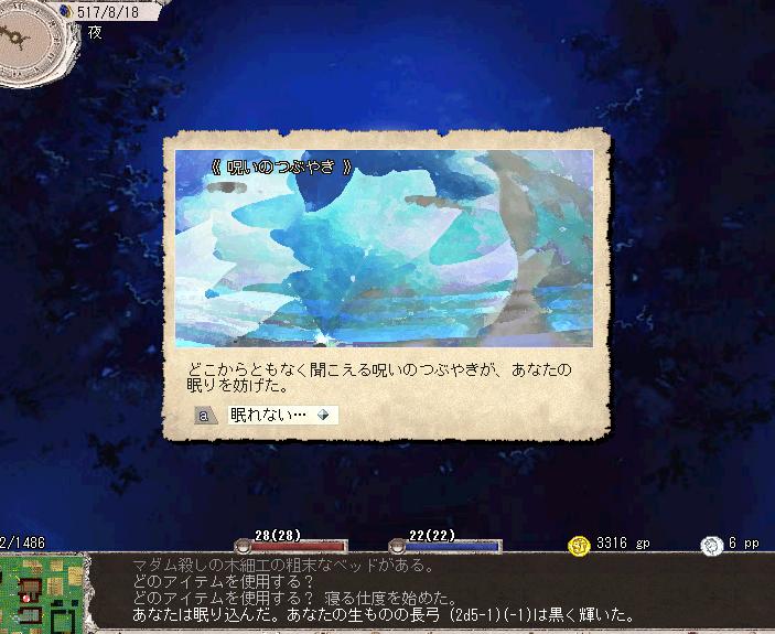 街中のベッドの上に立ち、ベッドを使う(tキー)ことで眠ることができます。ベッドであれば宿屋で無くともよく、持ち歩いていれば街のベッドを無理に使う必要はありません。どちらにせよ、質のいいベッドで眠ると潜在能力の伸びが良くなる為、いいベッドで寝ましょう。では、グッナイ。